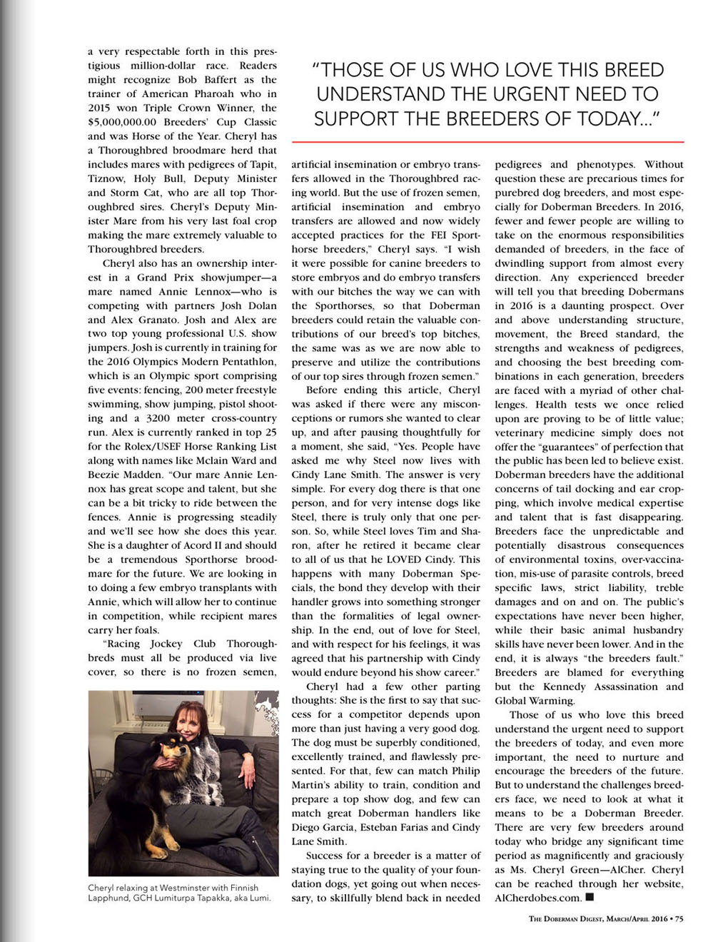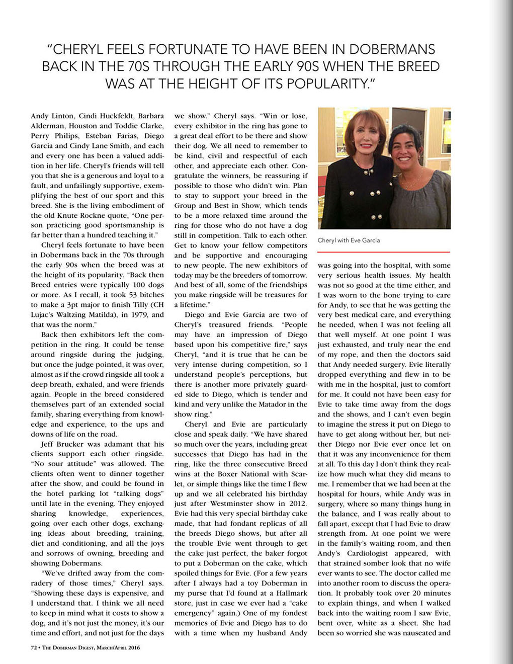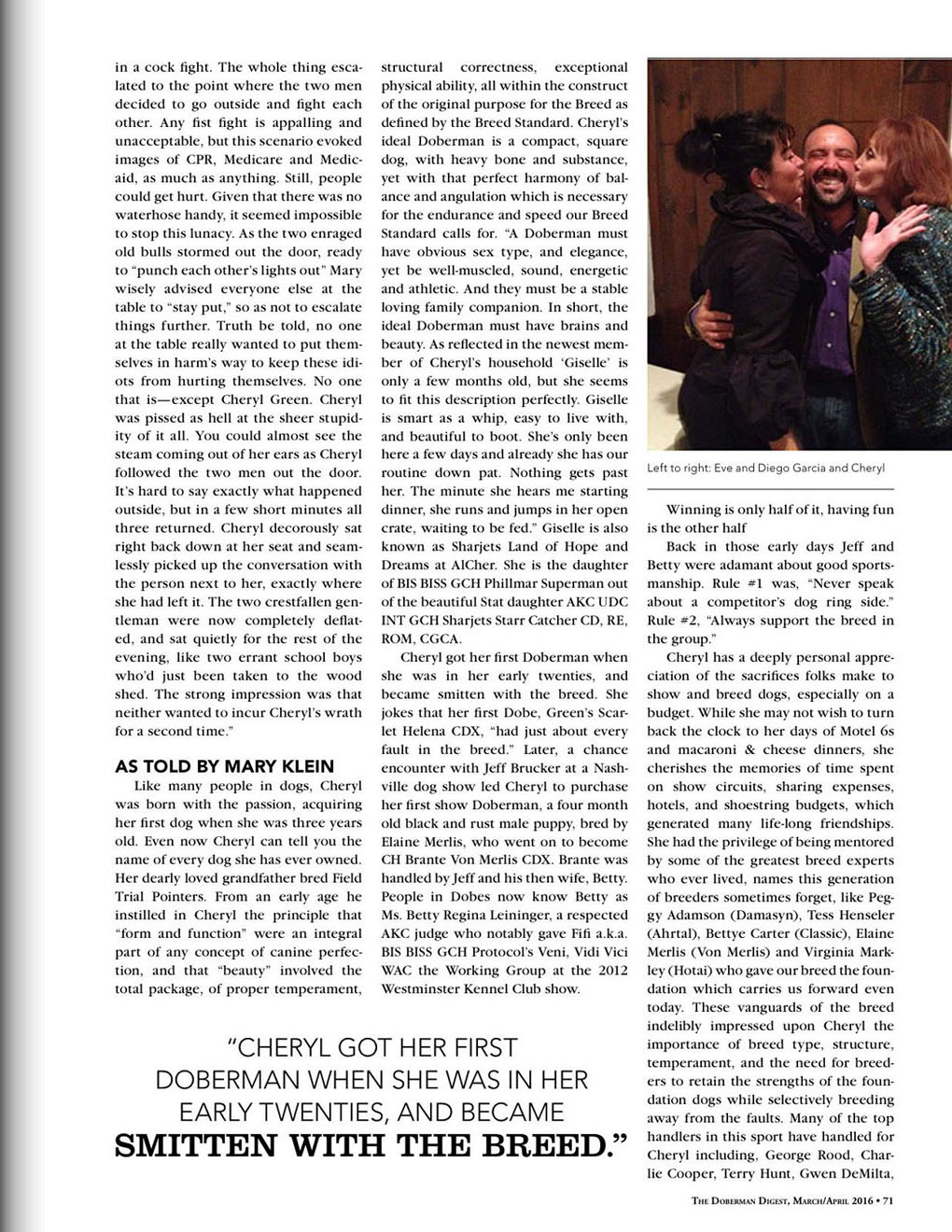 In March of 2016 I was honored to be the subject of Doberman Digest featured Breeder Article, which is provided below. Please Enjoy.