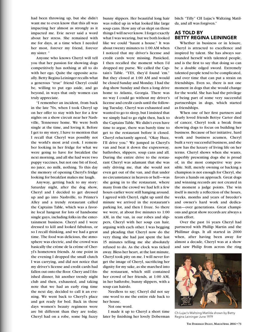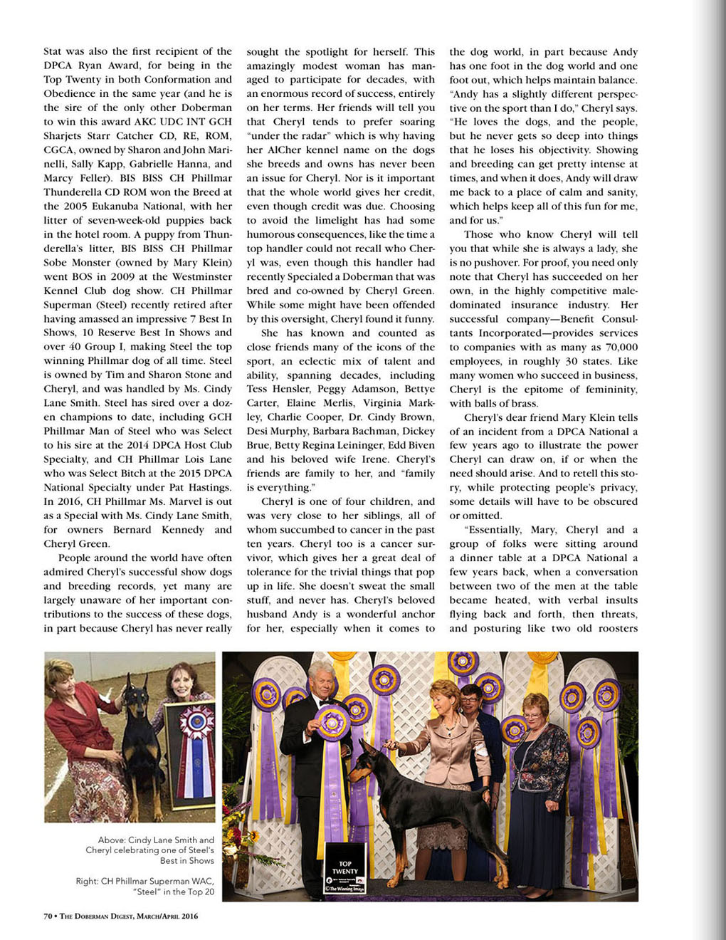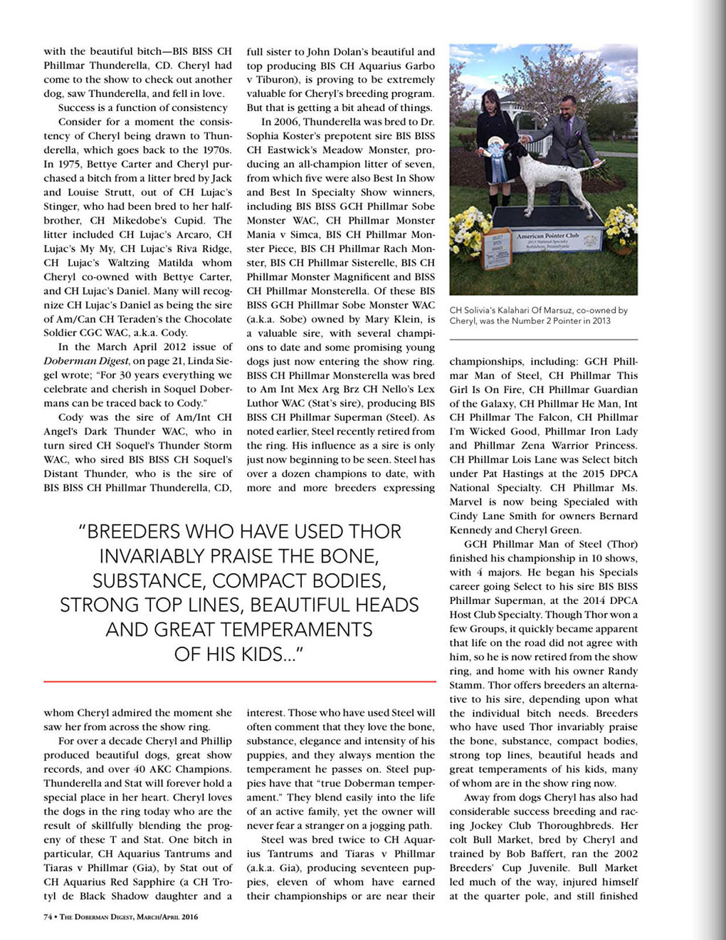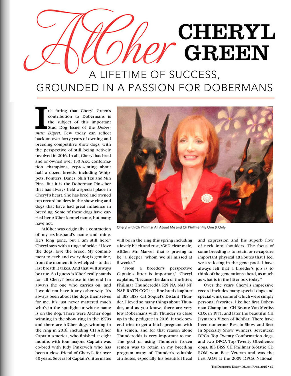In March of 2016 I was honored to be the subject of Doberman Digest featured Breeder Article, which is provided below. Please Enjoy.