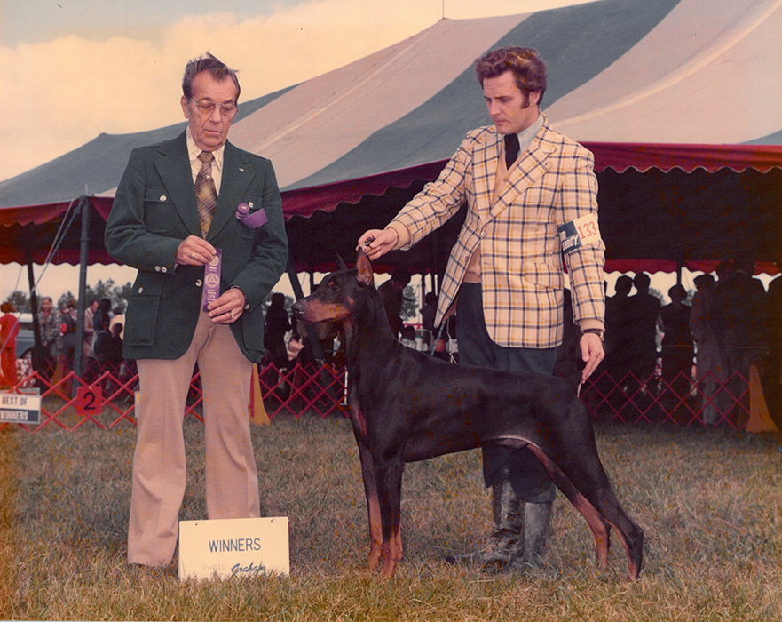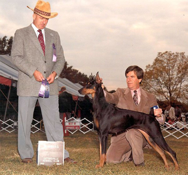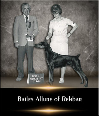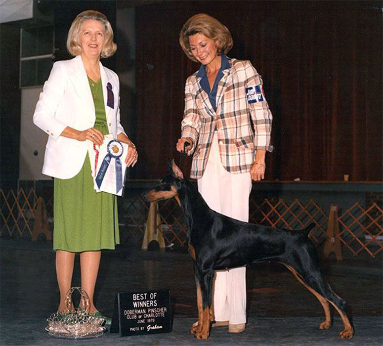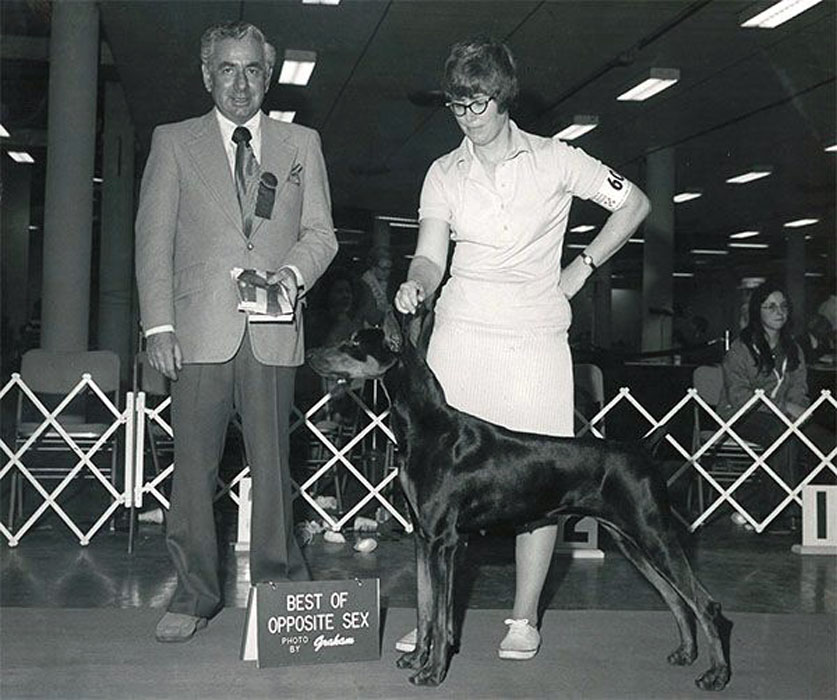 Ch Mikadobe's Cupid x Ch Lujac's Stinger Owned by: Dr. Aal Johnston and Cheryl Green Specialed by Betty Leinager. She achieved many Groups and Group Placements. Color: Black vWD: Carrier Hips: Normal OFA #:DP-1344 Here is a link to Tilley's pedigree on DobeQuest