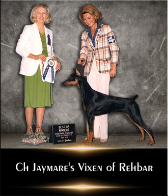 Classic's Damon D Schaftsohn x Ch Jaymares Vixen of Rehbar Owned by: Harvey & Bettye Carter and Cheryl Green Color: Red #7 bbDD vWD: Clear Hips: Good Here is a link to Ruby's pedigree on DobeQuest